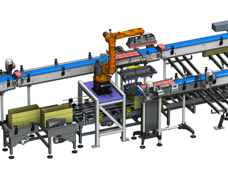Designed a box transport system based on roller and belt conveyors, featuring flow separation, a pick-point with automatic adjustment for two box sizes, and manual packing stations.